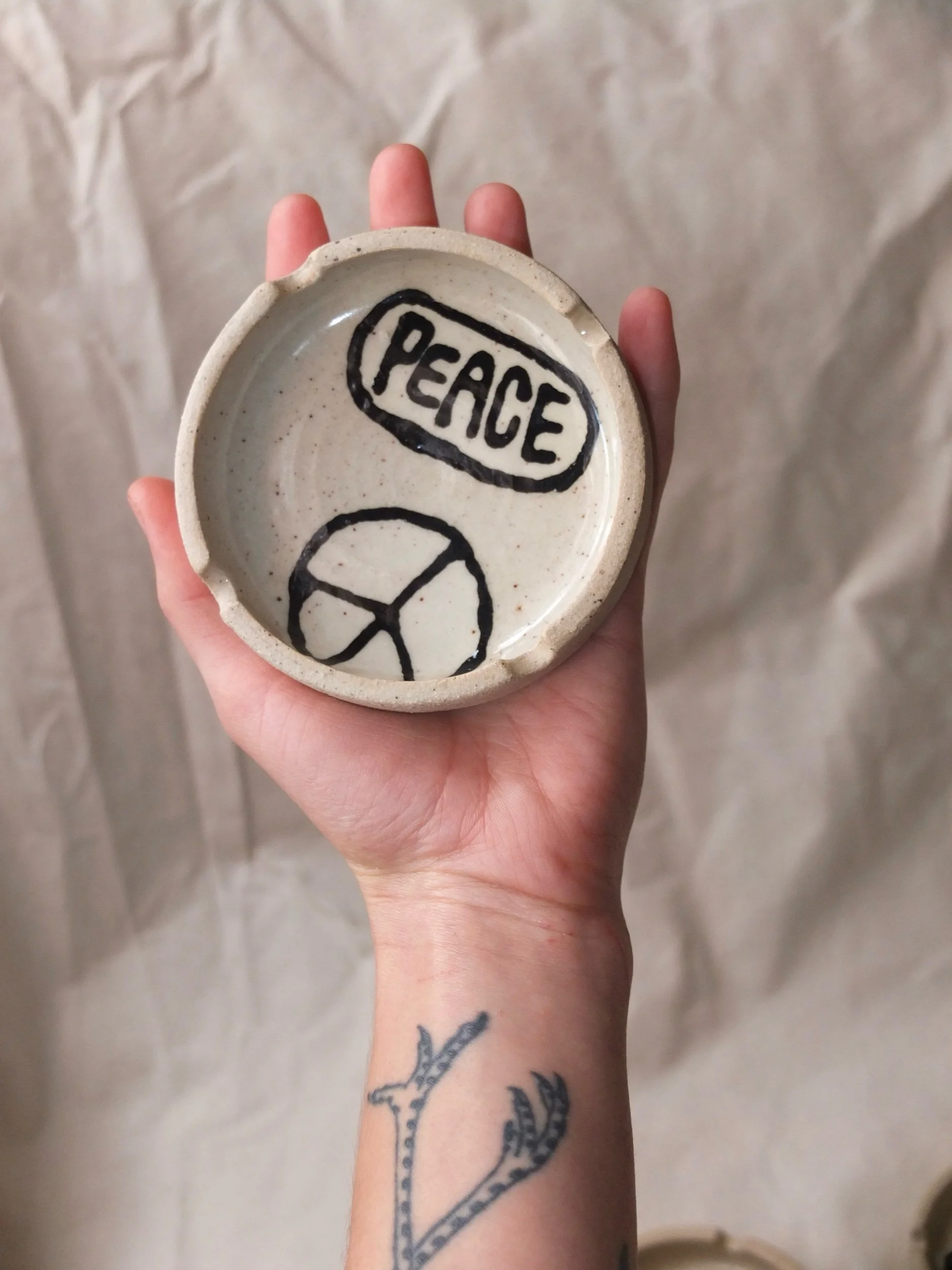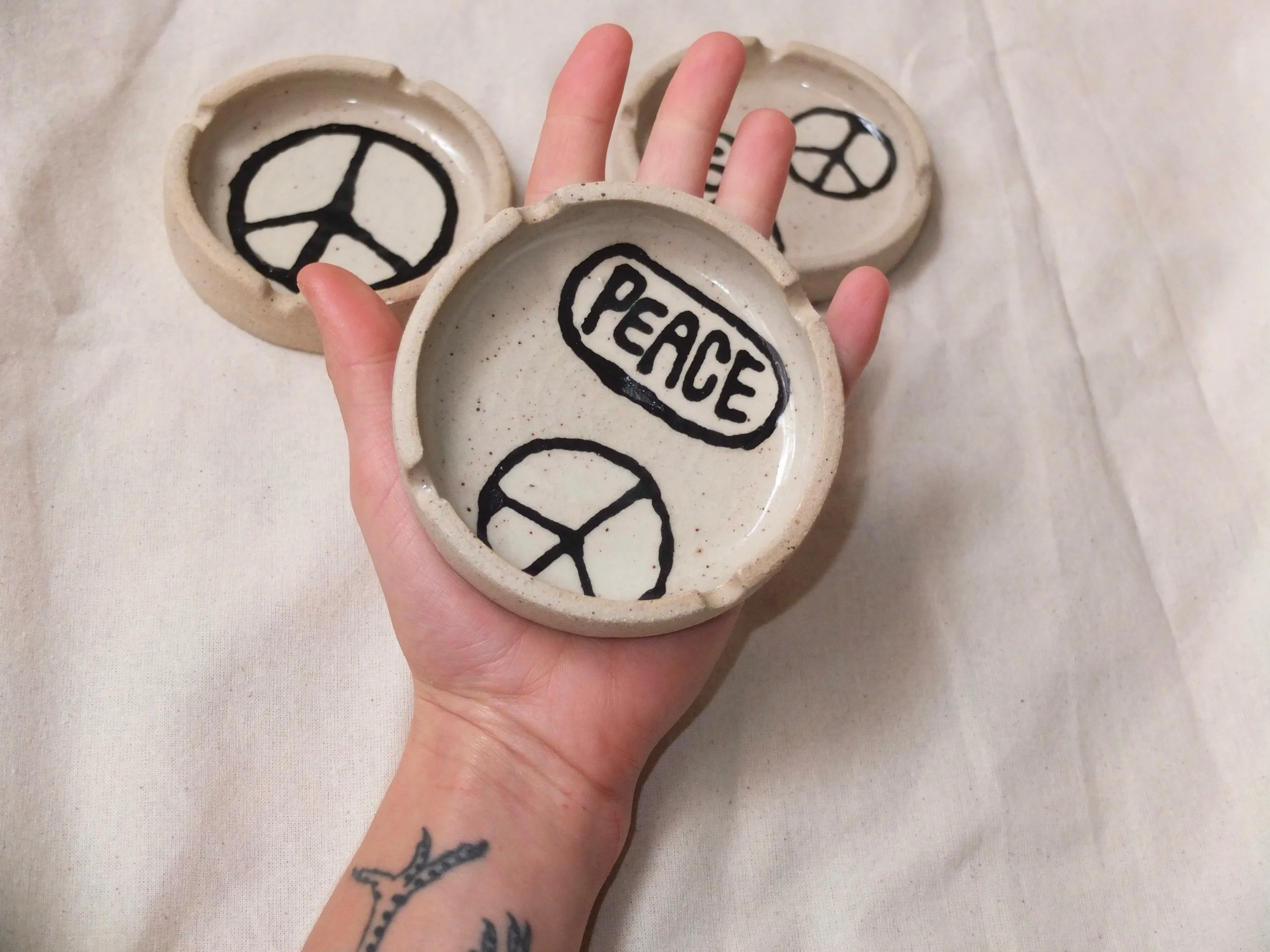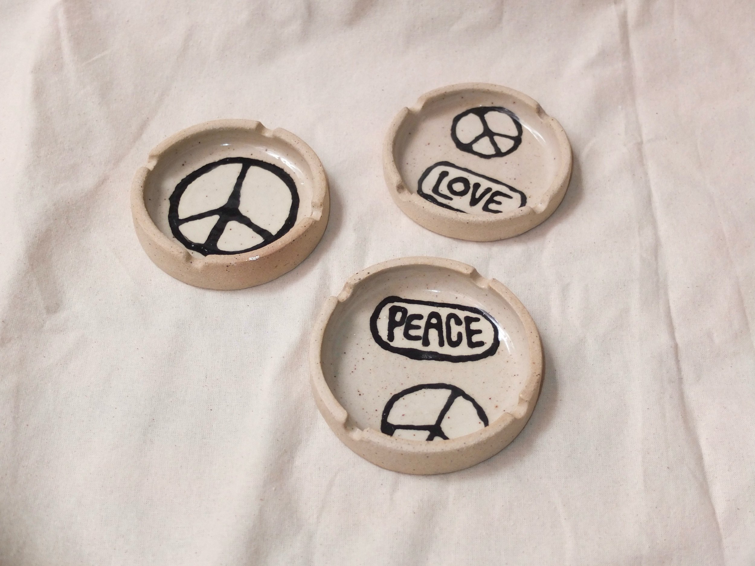 Image 1 of 4 Image 2 of 4 Image 3 of 4 Image 4 of 4 patch ash tray - peace $32.00 light tan clay ash tray with hand painted designs based off of vintage patches.interior gloss glazedexterior raw clay Add To Cart Added! light tan clay ash tray with hand painted designs based off of vintage patches.interior gloss glazedexterior raw clay