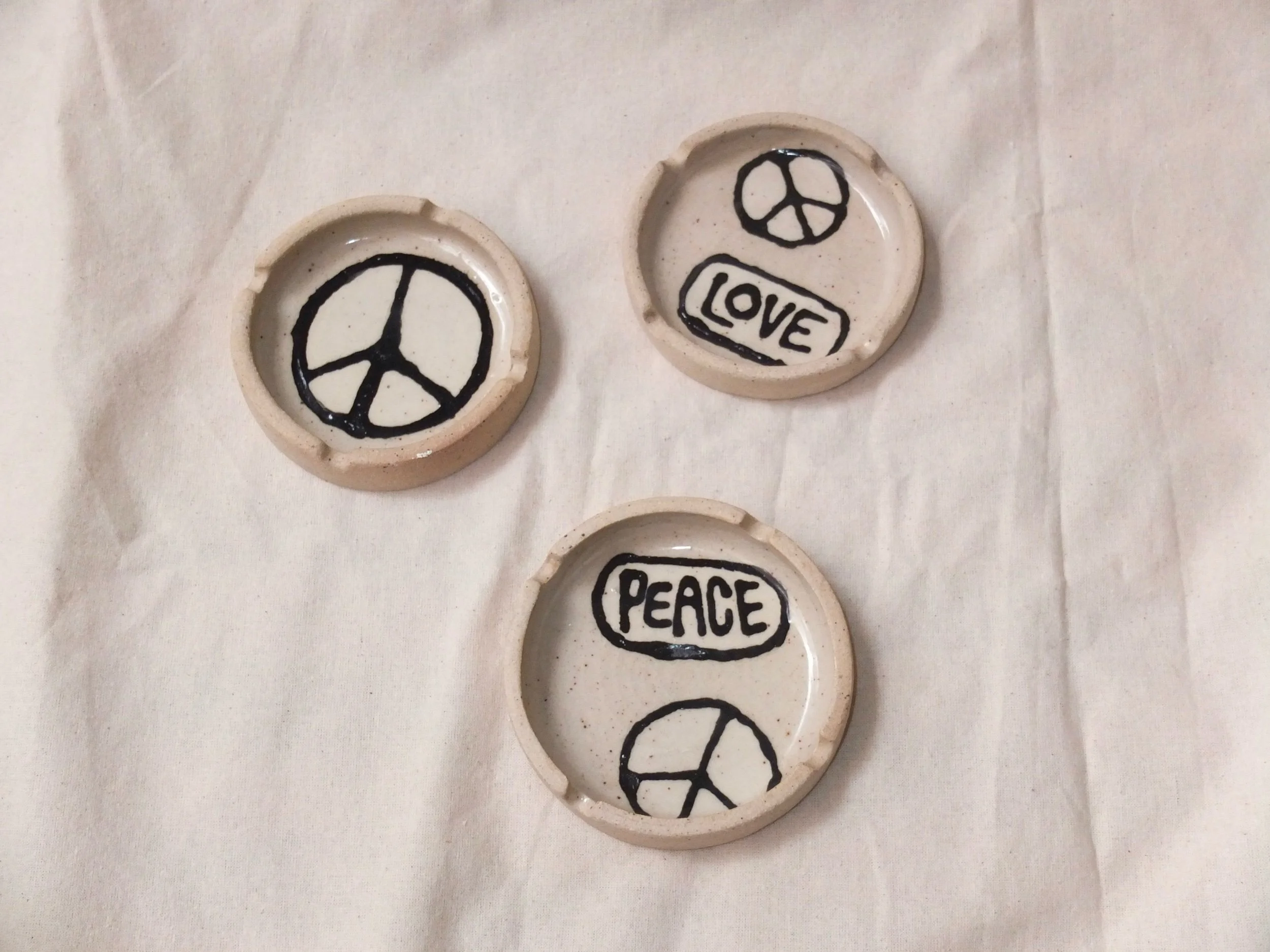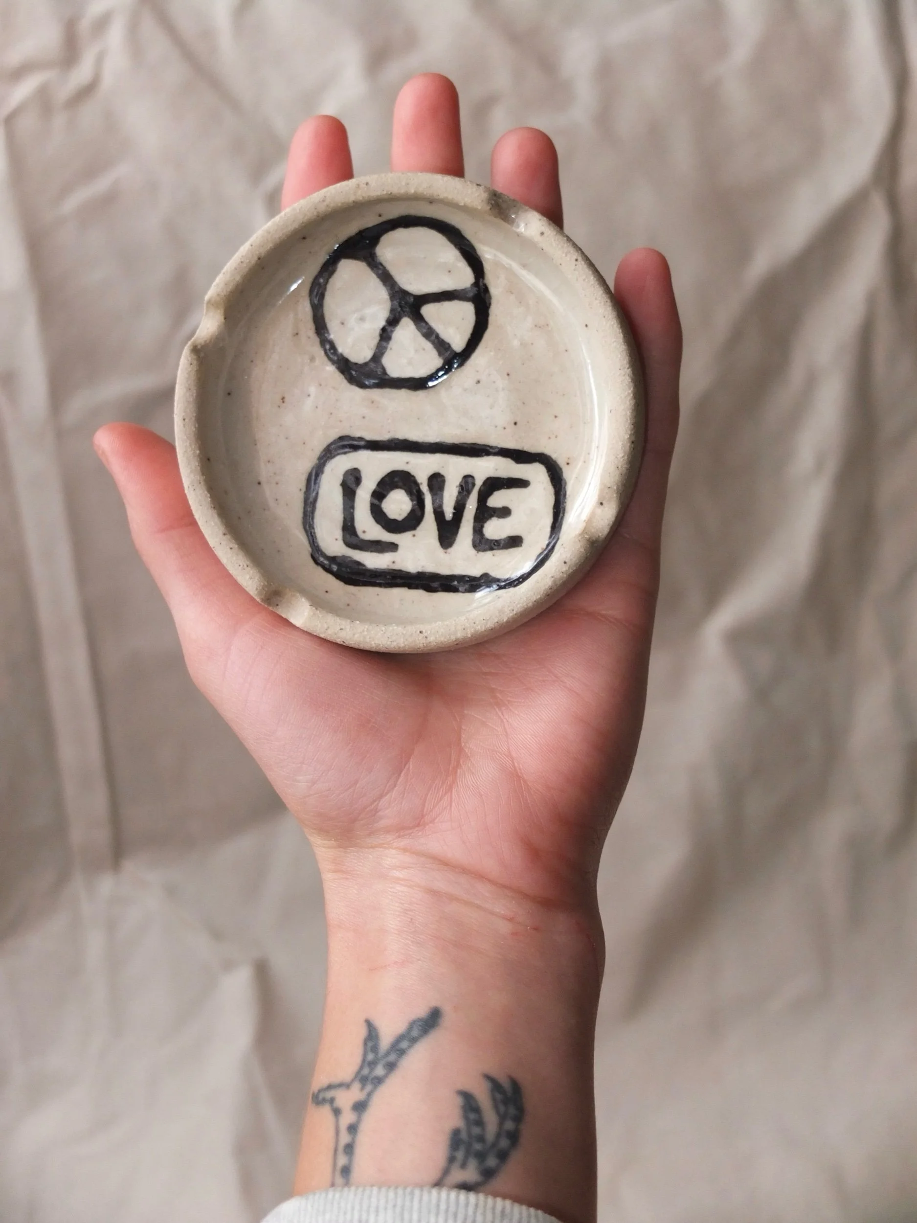 Image 1 of 3 Image 2 of 3 Image 3 of 3 patch ash tray - peace & love $32.00 light tan clay ash tray with hand painted designs based off of vintage patches. interior gloss glazedexterior raw clay Add To Cart Added! light tan clay ash tray with hand painted designs based off of vintage patches. interior gloss glazedexterior raw clay