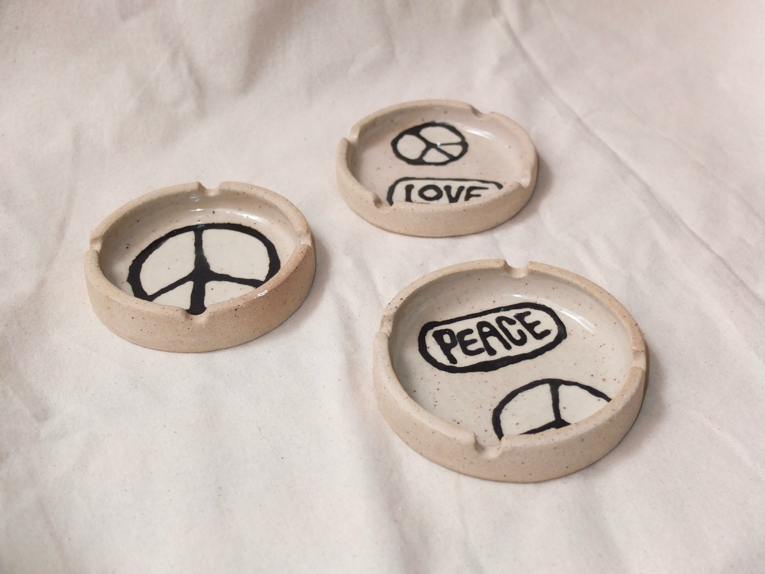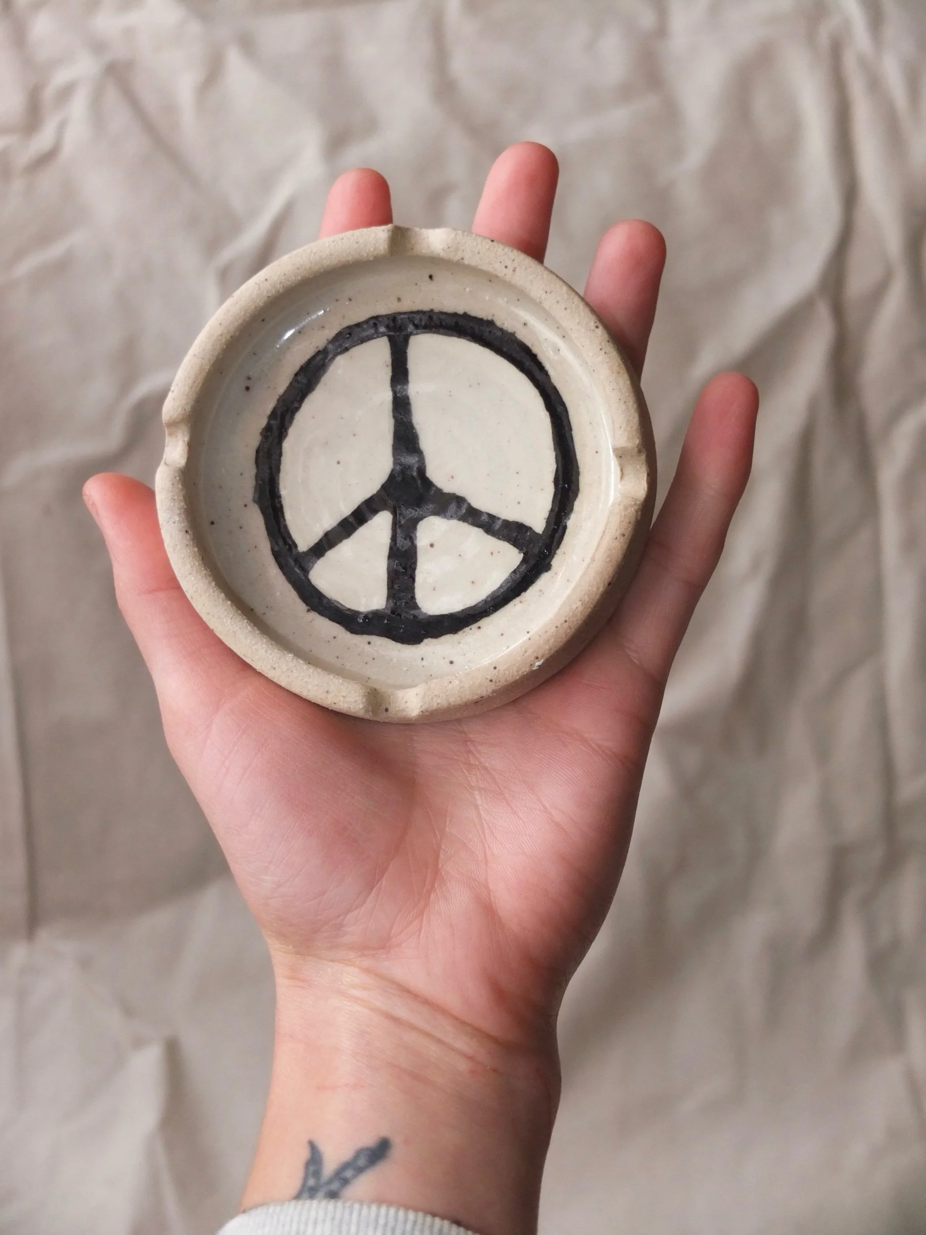 Image 1 of 4 Image 2 of 4 Image 3 of 4 Image 4 of 4 patch ash tray - peace sign $32.00 light tan clay ash tray with hand painted designs based off of vintage patches.interior gloss glazedexterior raw clay Add To Cart Added! light tan clay ash tray with hand painted designs based off of vintage patches.interior gloss glazedexterior raw clay